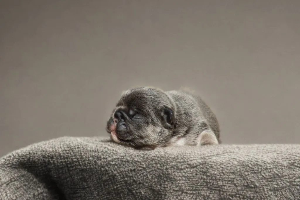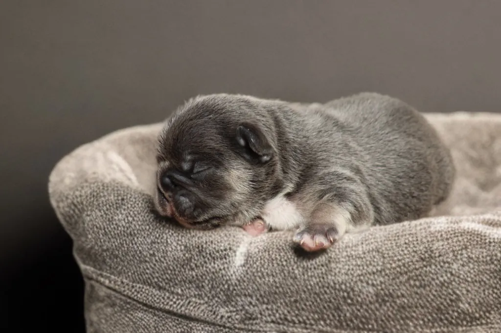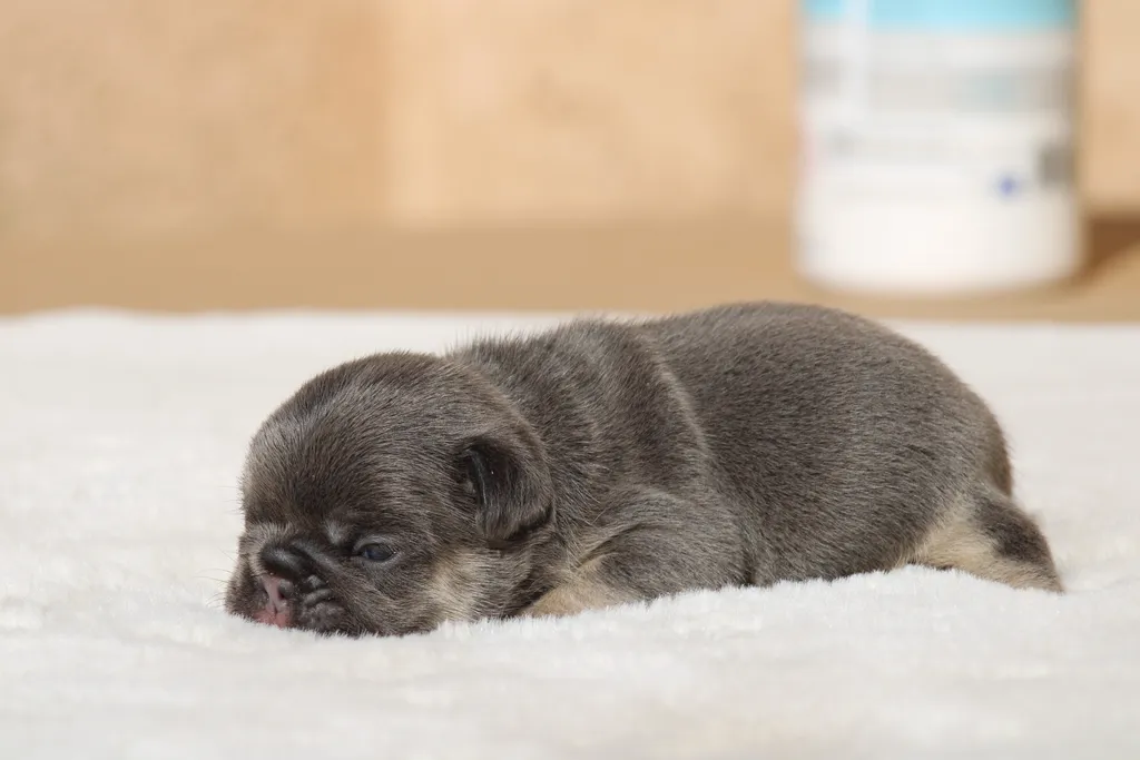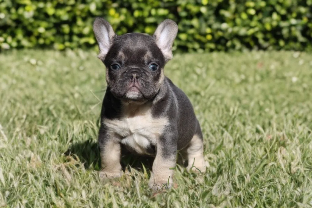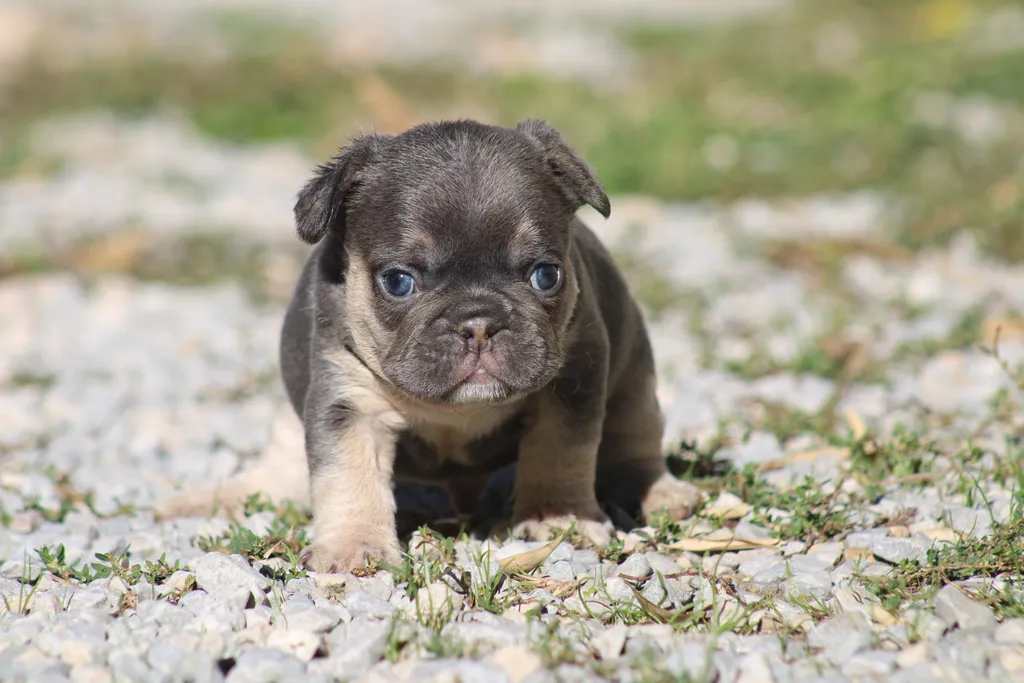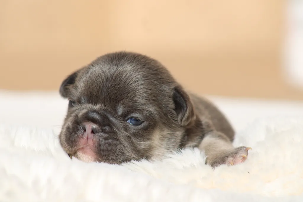 Description du chiot : Génie est un mâle bouledogue français exotique bleu tan. Plus petit que ses frères, il n’en est pas moins craquant, avec une belle morphologie naissante et un charme unique qui le rend déjà très attachant.