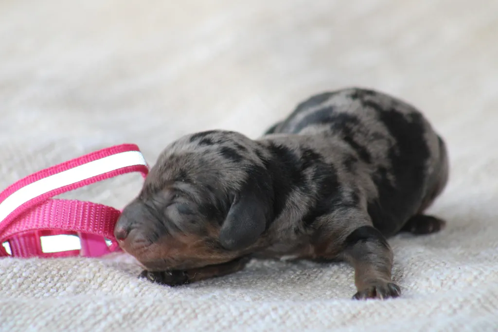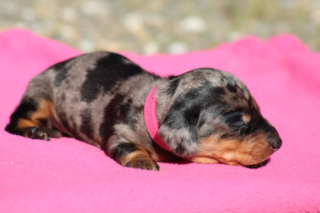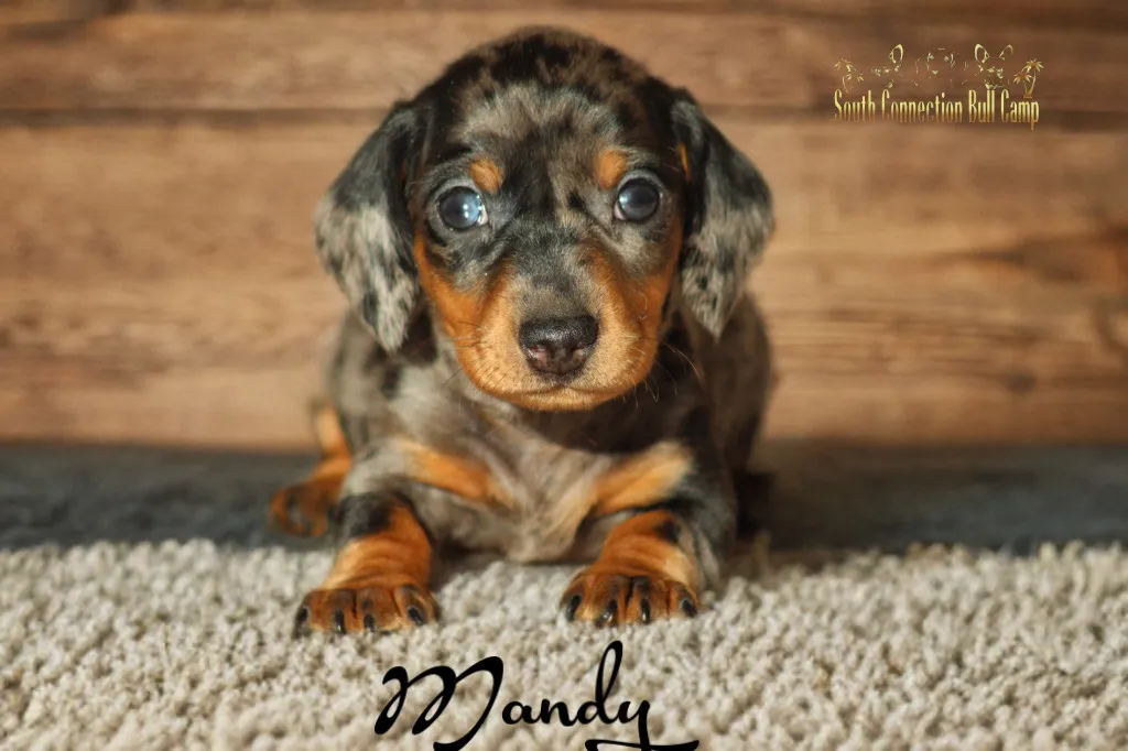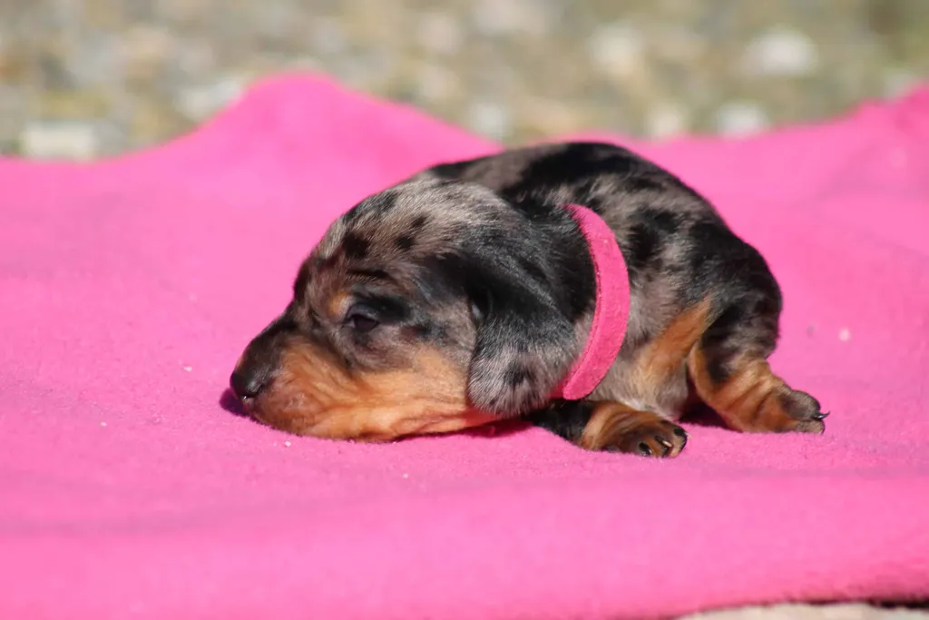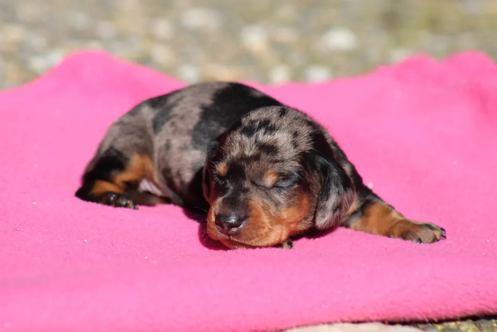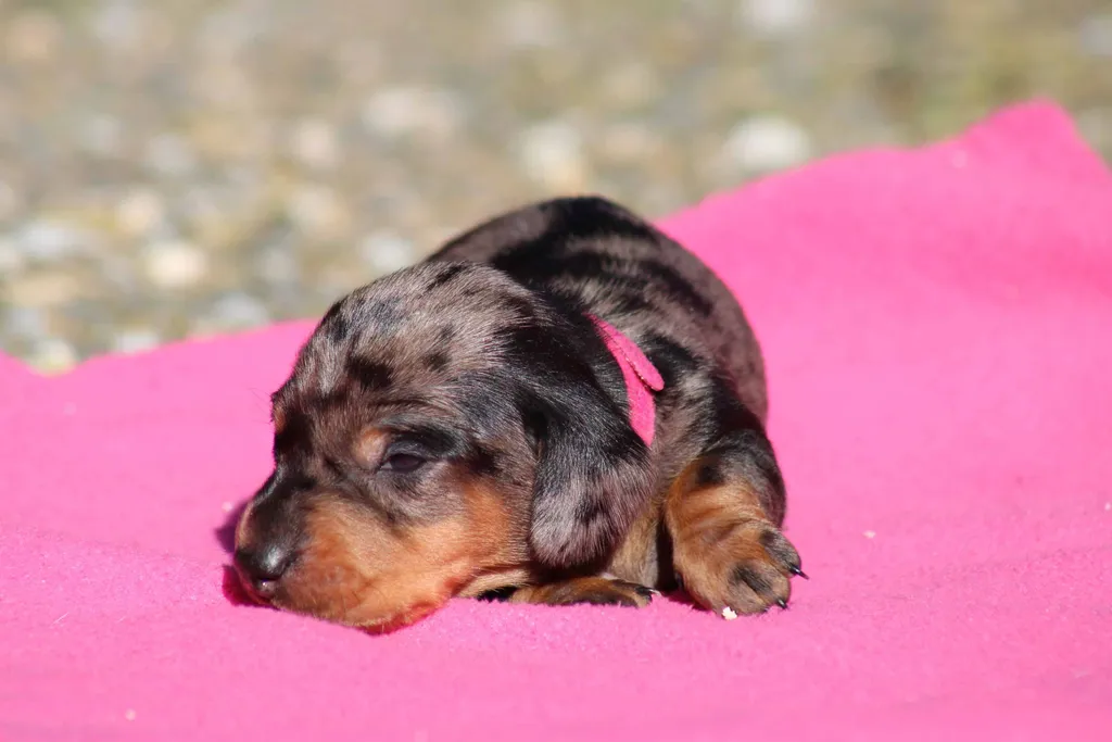 Description du chiot : L'élevage est fier de vous présenter Mandy By SCBC, une ravissante femelle Teckel à poil court. Née le 8 janvier 2026, Mandy arbore une robe Arlequin noir et feu (merle) aux contrastes magnifiques, complétée par de profonds yeux marrons pleins de douceur.